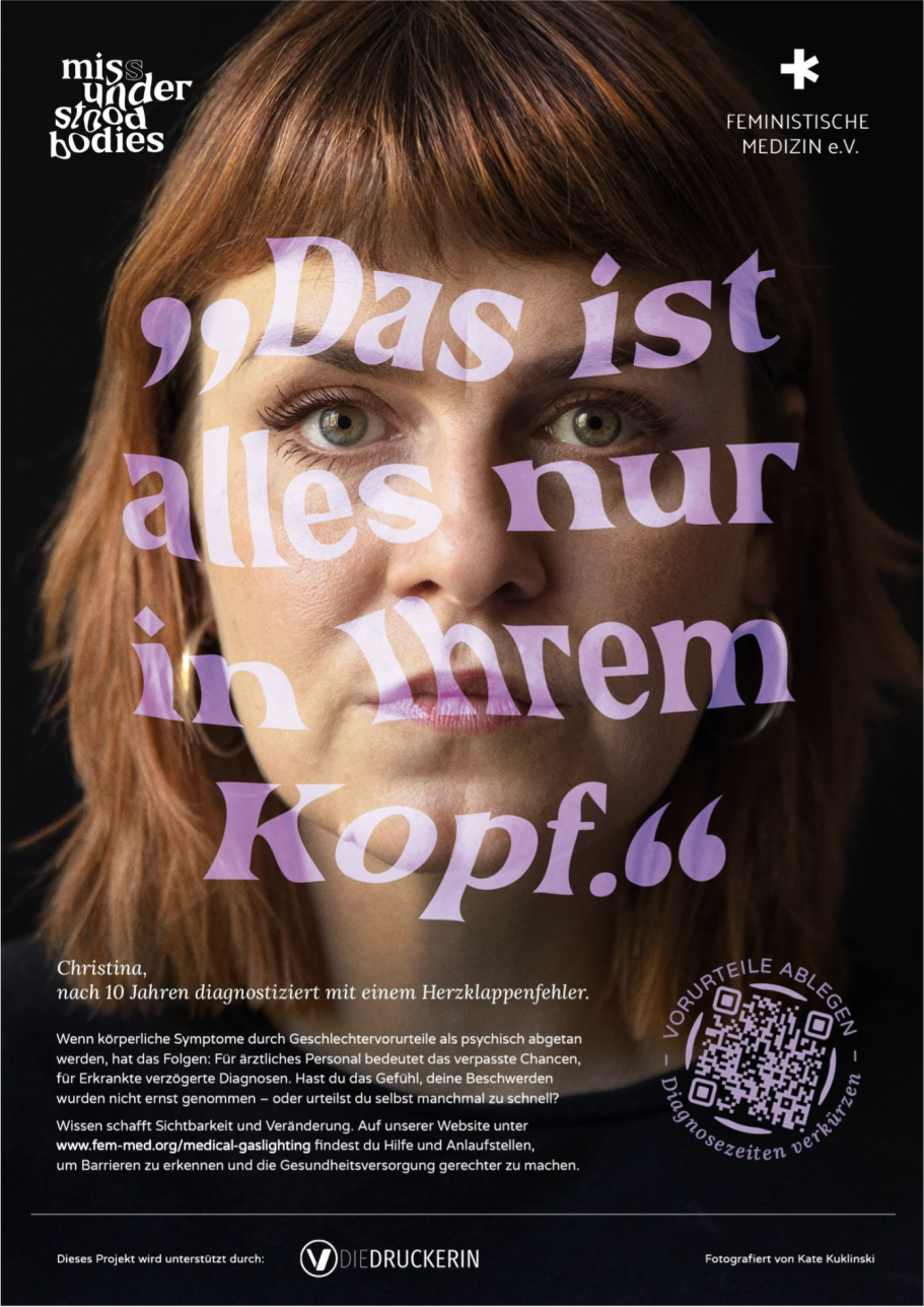 Christina steht stellvertretend für viele Betroffene und ist Teil dieser Kampagne, die zeigt, wie Medical Gaslighting im Alltag aussieht. 10 Jahre lang wurden ihre Beschwerden wie Schwindel, Atemnot und Herzrhythmusstörungen nicht ernst genommen. Erst dann erhielt sie die richtige Diagnose: eine hochgradige Mitralklappeninsuffizienz. Weil die Erkrankung so lange unerkannt blieb, war bei Christina eine Herzoperation unausweichlich.